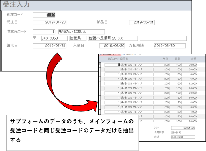 メインフォームにサブフォームを取り込むと、メインフォームの共通フィールド(今回は受注コード)と同じ値のデータだけがサブフォームに表示されます(図1参照)。