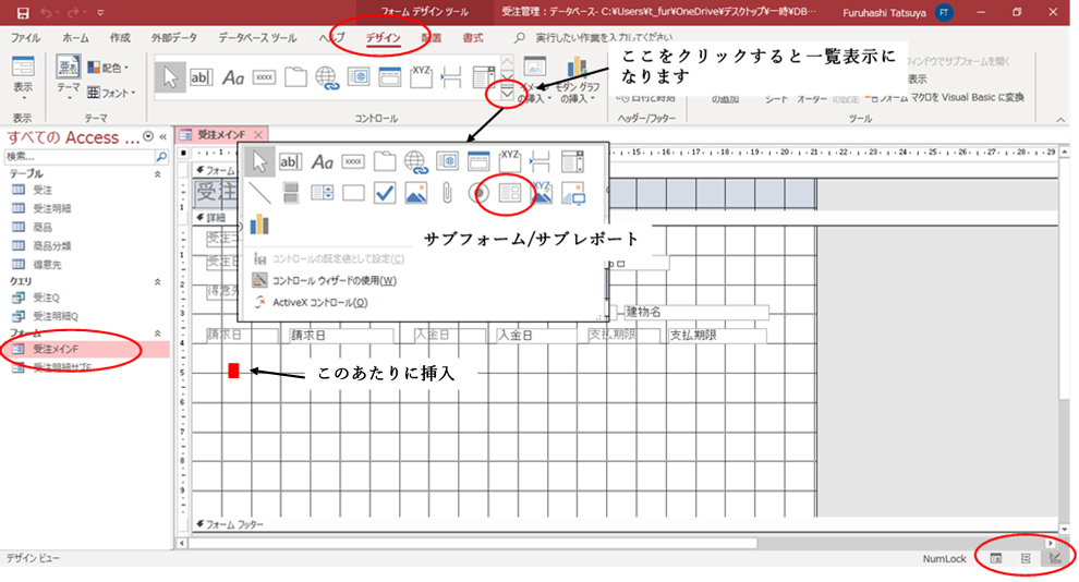 「受注メインF」と「受注明細サブF」を別々に作成しましたので、今からメインフォーム内にサブフォームを取り込みます。