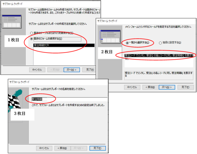 「サブフォームウィザード」が起動します(図3参照)。1枚目の画面ではどのフォームをサブフォームとして取り込みますかという意味です。「既存のフォームを使用する」を