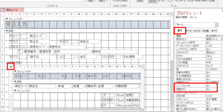 デザインビューに切り替え、サブフォームのフォームが選択された状態(図2参照)で、プロパティシートの「レコードセレクタ」と「移動ボタン」を「いいえ」に