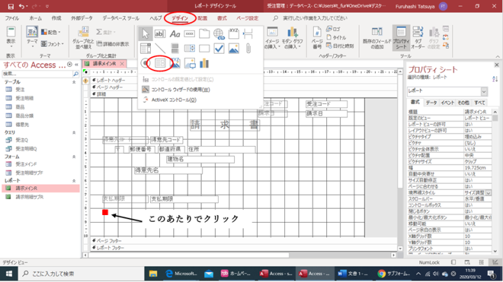 「請求メインR」をレポートビューで開きます。「デザイン」タブから「サブフォーム/サブレポート」を選択し、
