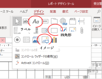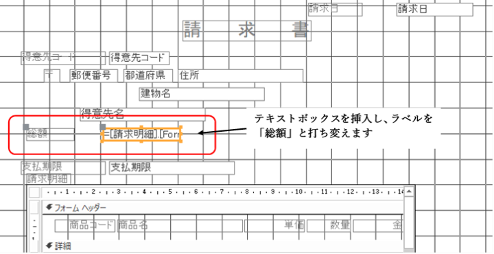 総額欄を表示するために、「デザイン」タブからテキストボックスを選択し、「得意先名」の下でクリックして挿入します。