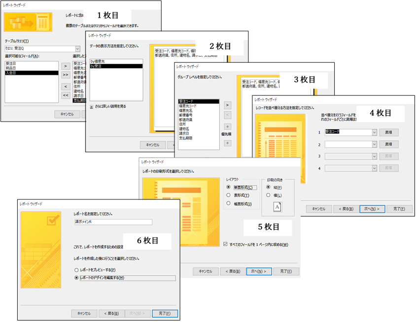 6枚目の画面はレポート名の指定です。今回は「請求メインR」とします。こののちレポートのデザインを変更しますので、「レポートのデザインを編集する」を