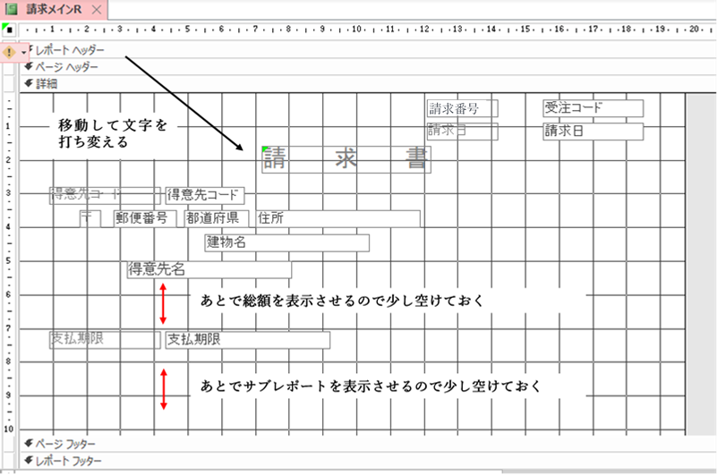 今回は図3のようにレイアウトを変更します。レポートヘッダーにあるラベル「請求メインR」は詳細に移動し文字を打ち変えレポートヘッダー閉じておきます。