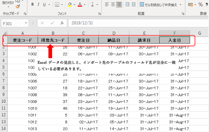 またExcelの各列のデータが、インポート先のフィールドのデータ型と一致している、フィールドサイズが範囲内に納まっている必要があります。