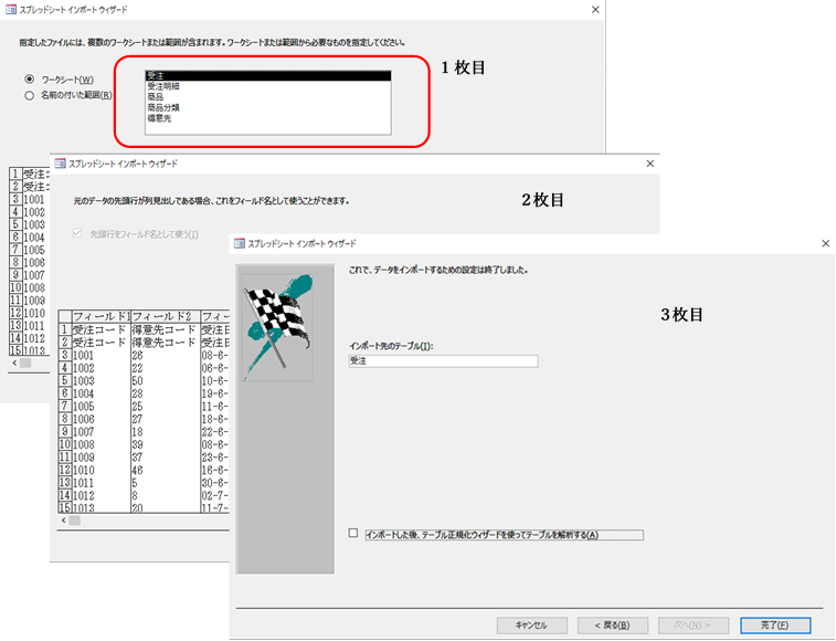 Excelファイル「ダウンロードデータ」では、インポート先のテーブル名とシート名を一致させていますので、「受注」テーブルにインポートするのは